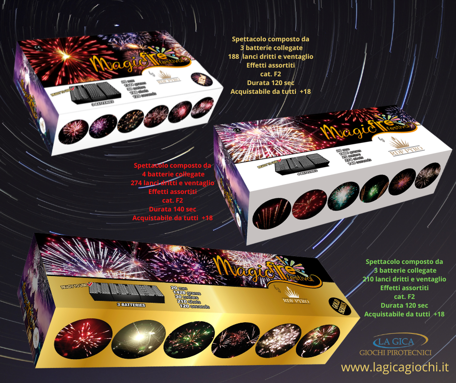 Batterie pirotecniche di ogni genere, da 16 a 400 lanci, effetti, durata e prezzo.