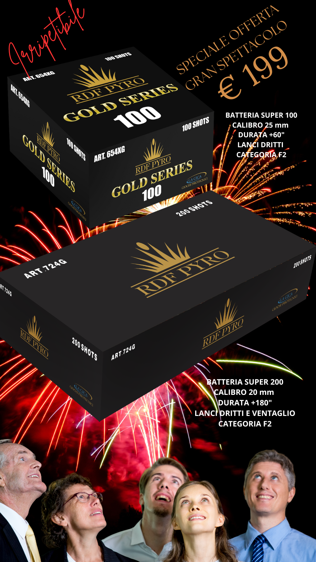 Batterie pirotecniche di ogni genere, da 16 a 400 lanci, effetti, durata e prezzo.
